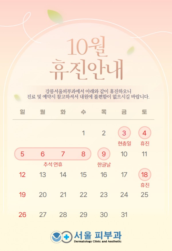 서울피부과 10월 휴진안내 페이지 정보 작성자: 서울피부과 작성일: 25-09-29 14:54 관련링크 다음글 목록 본문 10/3(금)~10/9(목) 휴진 10/18(토) - 휴진 서울피부과에서 아래와 같이 휴진하오니 휴진 일정을 참고하여 내원 시 불편 없으시길 바랍니다.